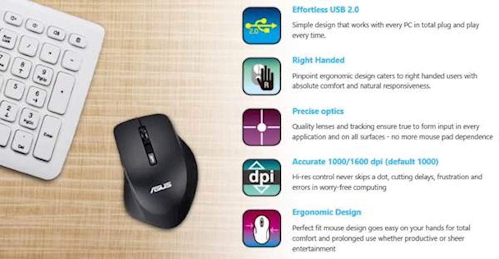 Elegantan i praktičan, ASUS WT425 miš će Vam poslužiti u svakodnevnom radu i savršeno će pristajati Vašoj ruci. Sa 6 tipki, ovaj miš pruža mogućnost efikasnijeg rada.