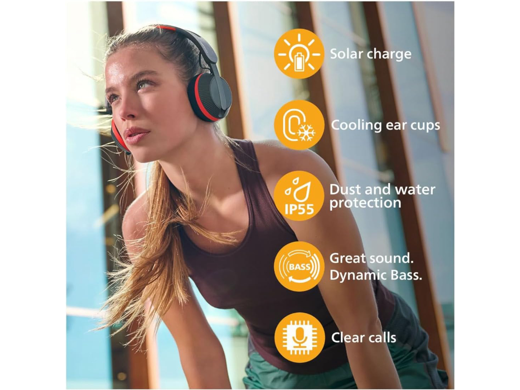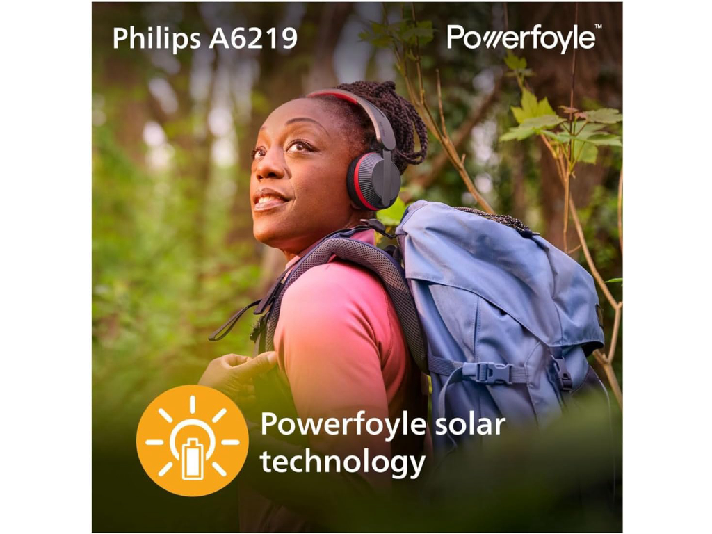 Philips TAA6219BK BT slušalice; Solarna tehnologija Powerfoyle; Samopunjive slušalice; Rezerva baterije od 80 sati; Perivi jastučići za uši; zaštita IP55; BT u više tačaka; za aktivan stil života