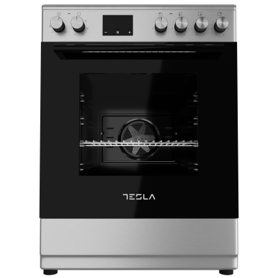 TESLA Šporet CV6400SX; Samostojeći – Staklokeramički; 4x zone; Ventilator; Display sa 3 dugmića; Timer; Bez poklopca; 6x Funkcija pećnice; Čišćenje parom; Dvostruka crna staklena vrata; 1x pleh + 1x rešetka + 1x duboka; Ladica; net ŠxD = 60×60; INOX